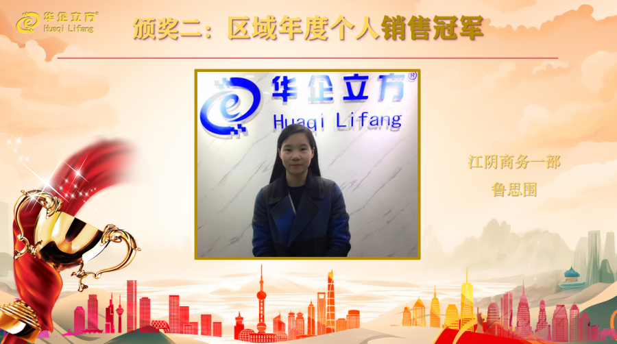 岁月留痕,人生无悔,从她身上我们看到的是兢兢业业、甘于付出的忘我工作。作为老员工,她尽心尽力,全力而为,用非凡的胆量,向我们演绎了华企销售的奇迹;用销售业绩成为所有员工的楷模,用能力证明她是华企立方当之无愧的销售冠军,她就是江阴商务一部鲁思围-2023年度区域销售冠军的获得者。