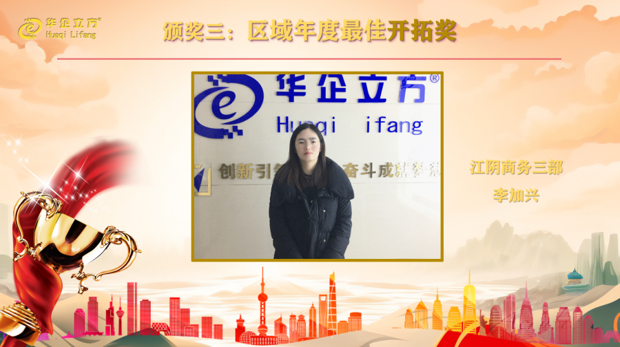 随着公司业绩的增长,需要有人不断的去寻找新的增长点,去开拓新的市场,新的客户。在任务重,工作量大的情况下,她用汗水与智慧,克服了重重困难,销售业绩逐月递增,江苏华企立方2023年度区域开拓奖的获得者就是江阴商务三部李加兴,她迎难而上、锲而不舍,她心中有信念,前方有梦想,任何困难都无法阻挡她前进的脚步。